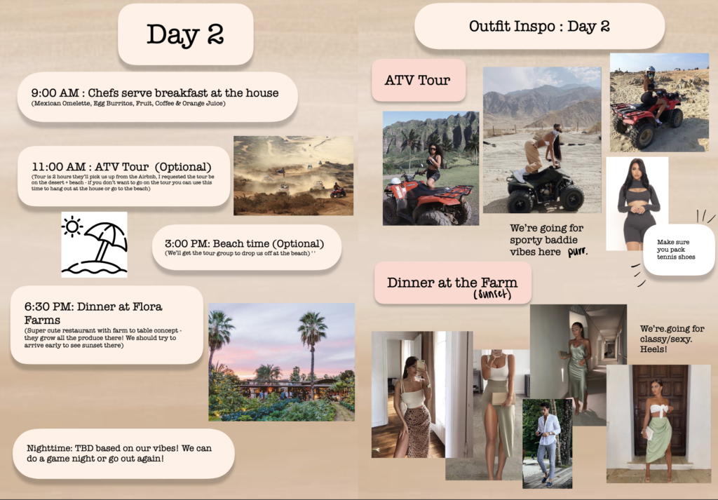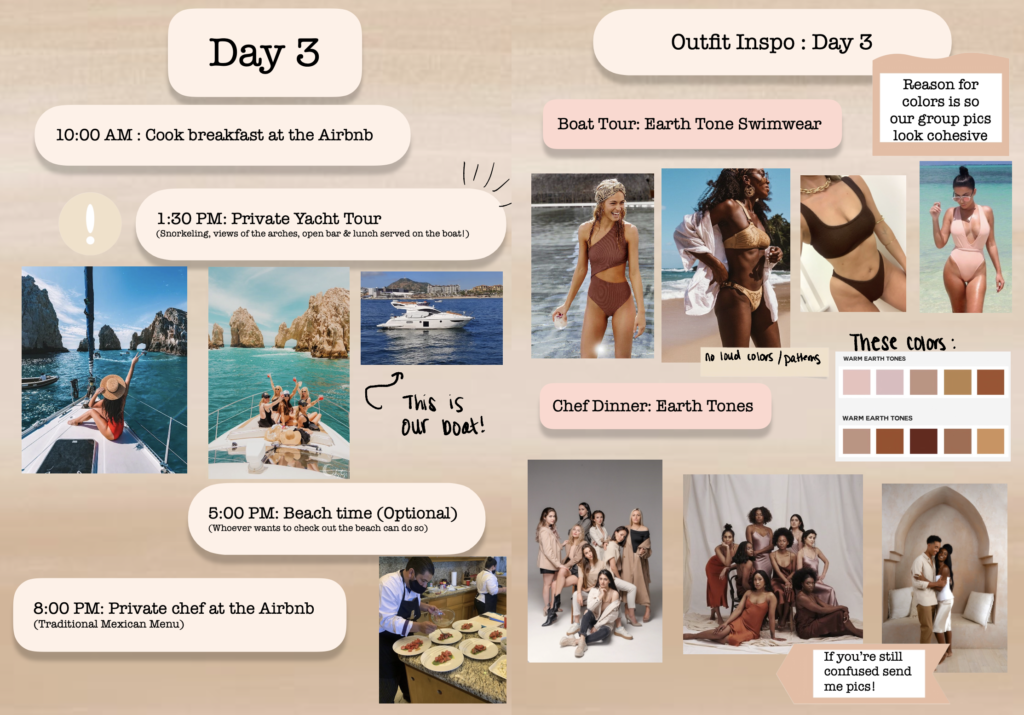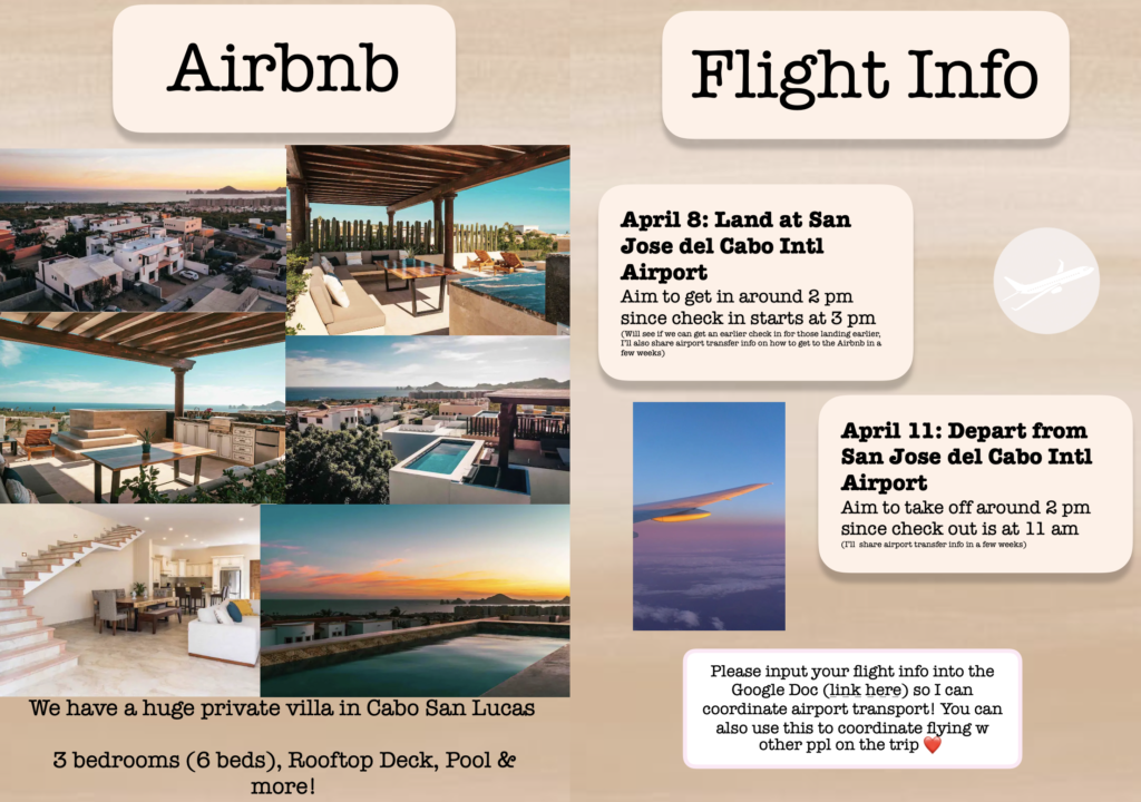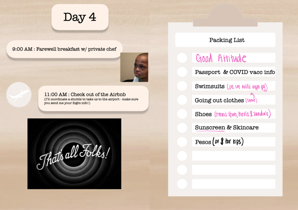 My friend had her birthday in Los Cabos, and provided each attendee with this PDF itinerary of our trip, so that we could all pack accordingly. Is that not dreamy or what?!